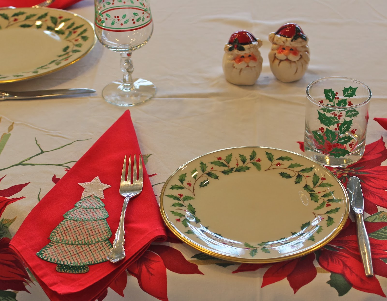 I made the napkins years ago, blanket-stitching different shapes of Christmas trees onto plain red, cotton napkins using flannel quilting fabric and adding decorative buttons here and there on some.